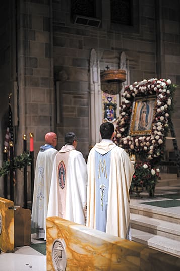 Msgr. Francis McNamee, Father Juan Carlos Villota Viteri and Father Jared Kleinwaechter of the Cathedral of Christ the King gaze upon Our Lady of Guadalupe, celebrating her during the Mass on Dec. 11. Photo by Tim Durski