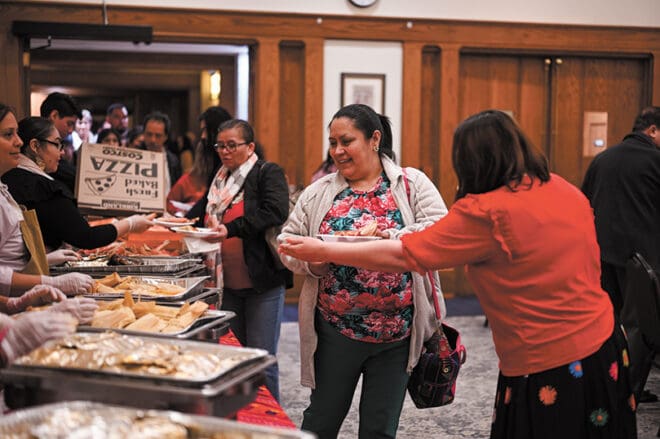 Cathedral parishioners share a variety of cultural dishes, including tamales and pizza, after the Wednesday Feast Day Mass. The celebration brought together families and friends, all honoring Mary. Photo by Tim Durski