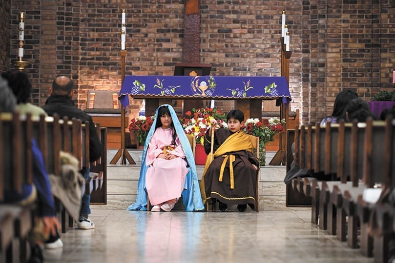 At Immaculate Heart of Mary Church, on Dec. 15, after sunset, scores of families filled the pews. They sang, prayed the rosary and then the two young characters of Mary and Joseph began their walk in the aisles of the church sanctuary. Two angels in white robes and with large wings walked behind guarding them.
