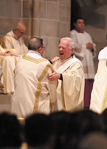 Deacon Bill Hampton, right, congratulates Deacon Tad George during the kiss of peace at the Mass of ordination to the permanent diaconate Feb. 1 at the Cathedral of Christ the King. Photo by Julianna Leopold