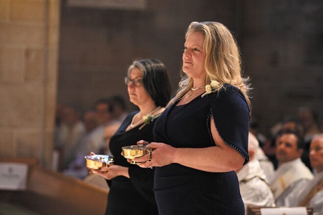 Kelly George and Paula Hein, wives of deacons, bring gifts up to the altar during the offertory at the Mass of ordination to the permanent diaconate Feb. 1 at the Cathedral of Christ the King. Photo by Julianna Leopold