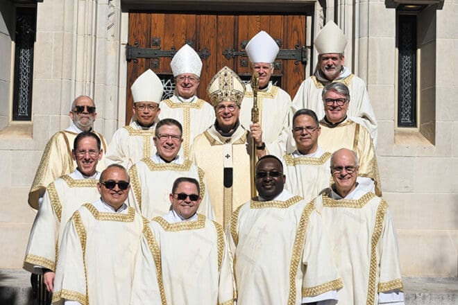 The seven new permanent deacons are congratulated by Deacon José Espinosa, co-director of diaconate formation, third row left; Archbishop Gregory J. Hartmayer, OFM Conv.; Bishop John N. Tran, Bishop Joel M. Konzen, SM; Bishop Bernard E. Shlesinger III and Deacon Dennis Dorner, director of the permanent diaconate, third row right, following the Mass of ordination Feb. 1 at the Cathedral of Christ the King. Abbot Augustine Myslinski, OCSO, of the Monastery of the Holy Spirit, back row right, also attended the ordination. Photo by Julianna Leopold