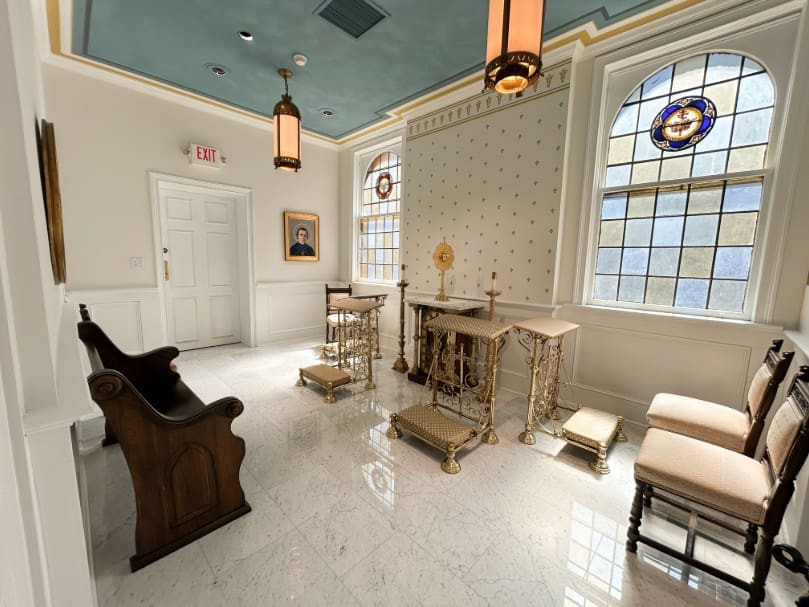 Historic furnishings were repurposed for the chapel: a sun-like monstrance rests on marble from the old tabernacle stand, with the brass details from the former ambo. Antique prayer kneelers from circa 1900 are used, in addition to the pew used by St. Teresa of Kolkata when she prayed at the church in 1995. Original portraits of the Albanian Indian saint and of St. Peter Chanel, Marist priest and martyr, decorate the walls.