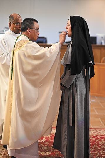 Sister Mary Seraphina receives communion from Bishop John N. Tran March 27 after taking her temporary vows as a diocesan hermit. She promised chastity, poverty and obedience to the archbishop. Photo by Julianna Leopold