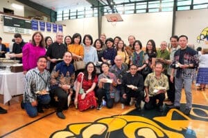 Father Jim Duffy, SM, standing at left, and Father Peter Pitol, kneeling in front, enjoy fellowship with members of Our Lady of the Assumption’s Indonesian community during a farewell celebration for the priests of the Society of Mary. Marists have served there since 1965 and will depart in June. Photo by Anne Stephens