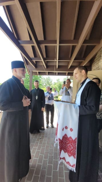 Father Volodymyr Petrytsya, pastor of Mother of God Ukrainian Catholic Church, at right, welcomes Archbishop Borys Gudziak, left, to the Conyers church May 18. The church community serves both Ukrainian immigrants and non-Ukrainian Byzantine Catholics. Photo by Mariangeles Burger