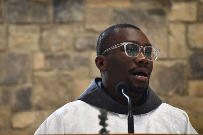 Friar Franck Lino Sokpolie, OFM Conv., speaks about his vocation journey to those attending his ordination Mass July 19 at Holy Cross Church, Atlanta. Photo by Jackie Holcombe