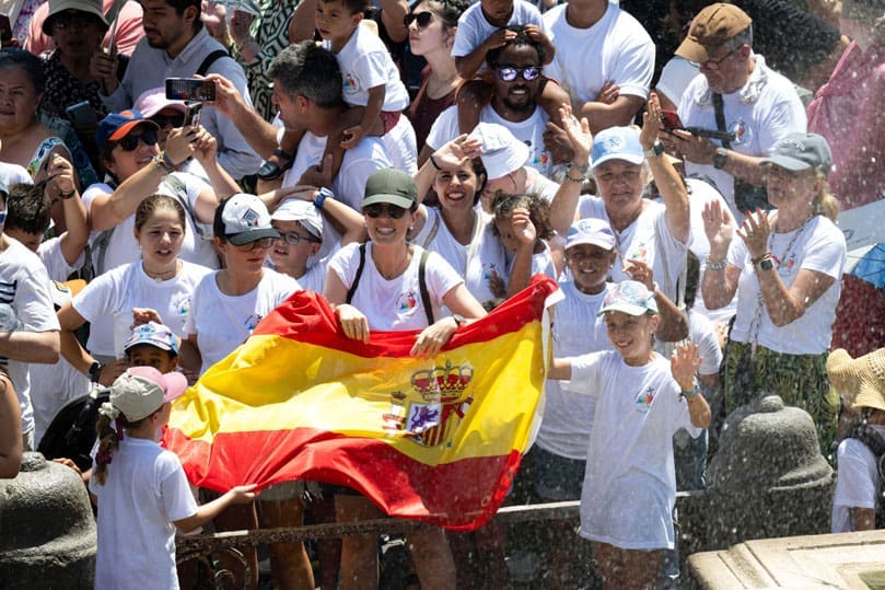 At the end of his Angelus address, Pope Leo greeted those from around the world who had come to St. Peter’s Square, saying “in the great heat of this time of year, your journey to pass through the Holy Doors is even more courageous and admirable!”