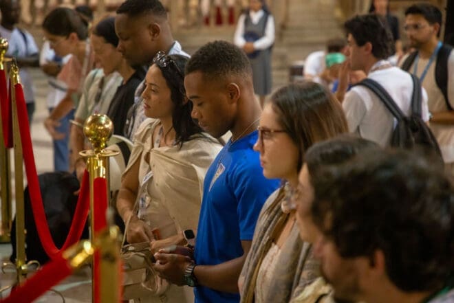 Pilgrims pray before the casket of Blessed Pier Giorgio Frassati at the Basilica of Santa Maria sopra Minerva in Rome July 31. The casket containing his remains was brought from his tomb in Turin, Italy, for veneration during the Jubilee of Youth. CNS photo/Pablo Esparza
