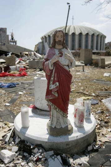 A statue of Jesus stands amid rubble near a destroyed grotto outside St. Michael Church in Biloxi, Miss., Sept. 12, 2005, in the aftermath of Hurricane Katrina. Aug. 29, 2025, marks the 20th anniversary of the deadly storm, which made landfall in the Gulf Coast region. The powerful storm claimed 1,400 lives, and caused widespread devastation. OSV News photo/Bob Roller