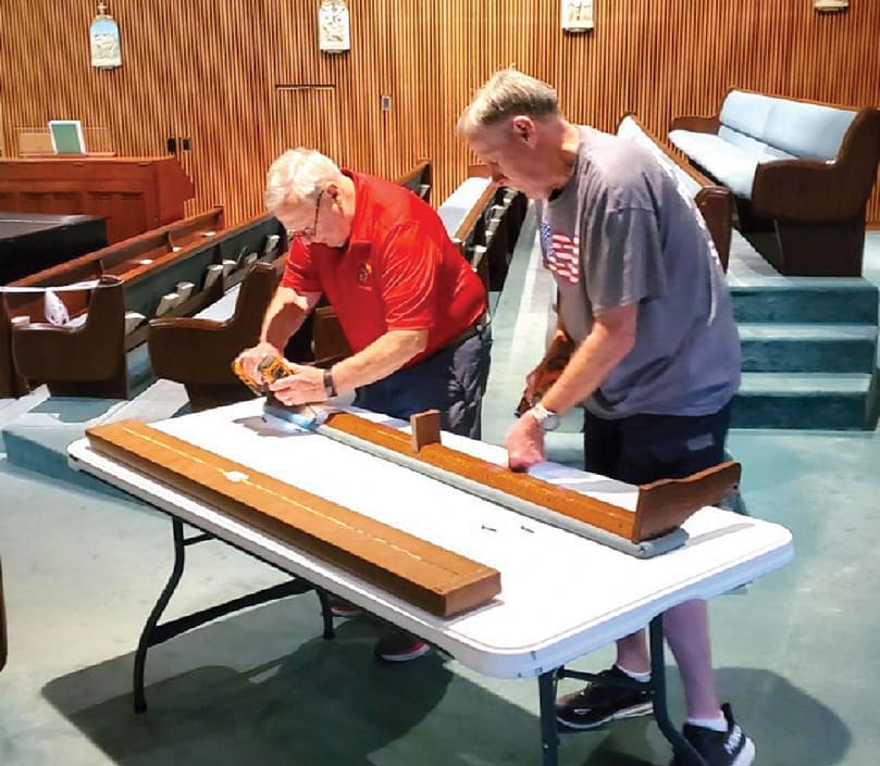 In addition to removing and replacing the 35-year-old cushions, the Knights replaced the “buffer pads” to reduce the noise when kneelers are lifted, repaired more than 60 trays that hold the prayer and song books, replaced several damaged kneelers, disposed of all old cushions and vacuumed every pew and the carpet.