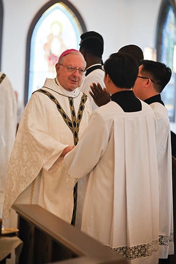 Bishop Joel M. Konzen, SM, greets the candidates for holy orders during the kiss of peace at the candidacy Mass at Christ the Redeemer Church in Dawsonville on July 29. Photo by Julianna Leopold
