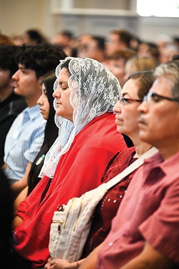 Maria Thompson, paraprofessional at St. Mary’s Academy, closes her eyes in prayer during the Mass of Thanksgiving for the new saints. Photo by Julianna Leopold