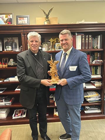 Bishop Bernard E. Shlesinger III, left, and Christopher Wagnon of St. Jude the Apostle Church met recently to talk about the establishment of a Catholic War Veterans group in Atlanta. Wagnon and fellow Catholic Jerry Tiarsmith of Mary Our Queen did the initial research to form the local post.