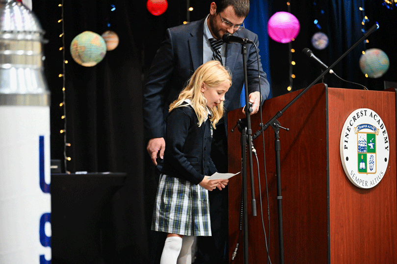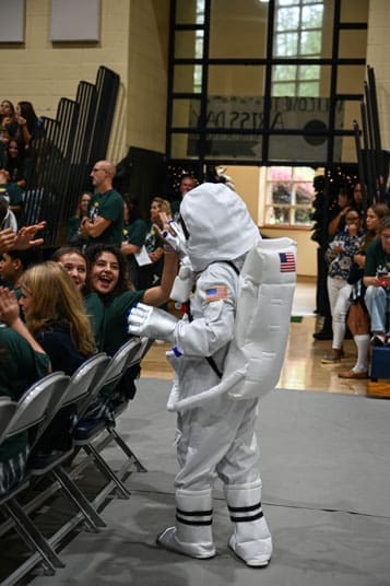 Nate Robinson of Pinecrest Academy, dressed as an astronaut, high fives classmates during the special assembly. Photo by Julianna Leopold