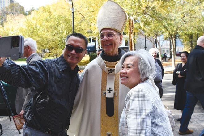 Archbishop Gregory J. Hartmayer, OFM Conv., takes a picture with parishioners following the joyful dedication Mass for the new altar and redecorated space at the Basilica of the Sacred Heart of Jesus. Photo by Jackie Holcombe