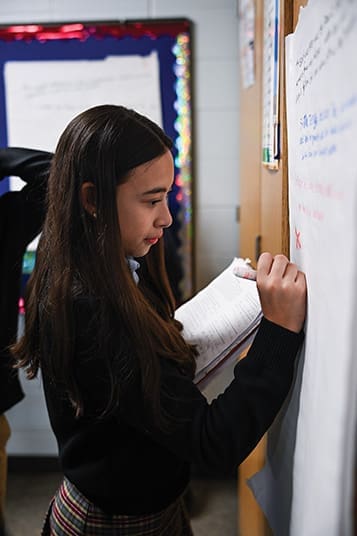 Daphney Garcia steps up to write her group’s answers on the board during her Language Arts class at St. John Neumann School. Daphney was one of the first students with learning differences to take part in the development of the Open Doors program of the Office of Catholic Schools. Photo by Julianna Leopold