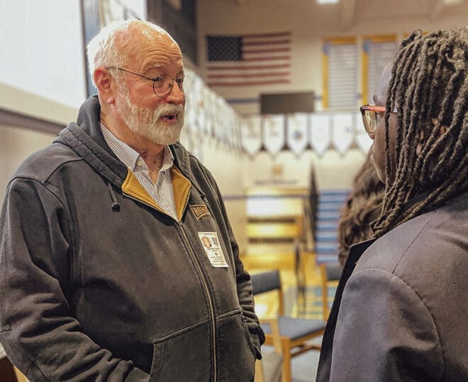 Father Greg Boyle answered questions from Greyson Smith, a sophomore at Cristo Rey Atlanta Jesuit High School after his talk focused on Homeboy Industries, which the Jesuit priest started to combat gang violence in Los Angeles. The program commemorated Dr. Martin Luther King Jr. Day. Photo by Andrew Nelson