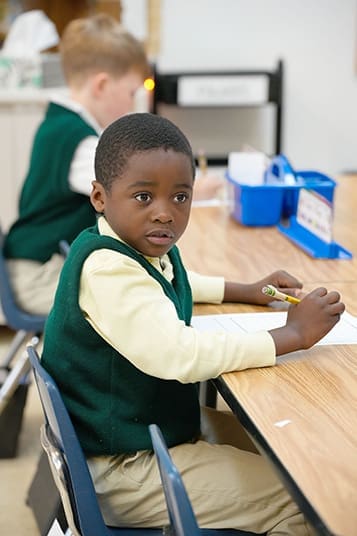 Kindergarten student Bash Kiley works on an assignment at Notre Dame Academy. On campus, students lead discussions, ask questions and engage deeply with their studies. Photo by Julianna Leopold