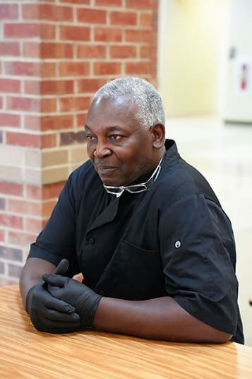 Chuck Welch Jr., known as “Chef Chuck” to the students, sits in the Notre Dame Academy cafeteria that he has called home for 20 years. The chef is known for preparing delicious meals and the strong relationships he builds with students. Photo by Julianna Leopold