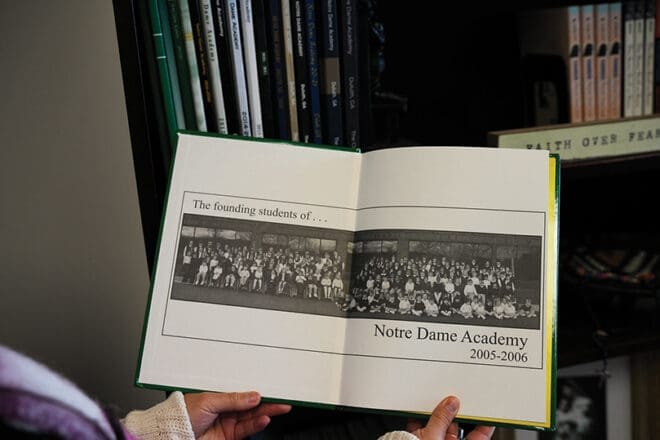 The first page of the Notre Dame Academy yearbook for 2005 features a photo of the founding students. This year, the school marks its 20th anniversary since its opening with just 151 students. Principal Julie Derucki said the mission remains the same as it was then— to support students intellectually and spiritually throughout their education. Photo by Julianna Leopold