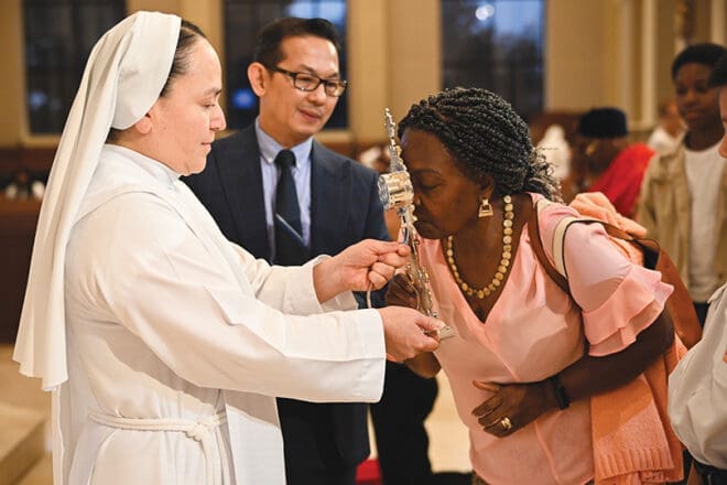 Sister Miriam Mendoza, RFR, holds the relic of St. Carlo Acutis for parishioners to venerate at the Mass of Thanksgiving for his canonization and that of Pier Giorgio Frassati Sept. 7. The local Mass was celebrated at Holy Vietnamese Martyrs Church, Norcross. Photo by Julianna Leopold