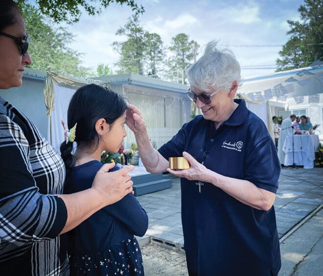 Sister Margarita Martin, a member of the Handmaids of the Sacred Heart of Jesus, blessed a youngster during the farewell Mass for the sisters on May 18. After two decades of living in a trailer park outside Athens, where they organized a tutoring program for neighborhood kids, the Handmaids were returning to be closer to their community members in Pennsylvania. Photo by Andrew Nelson