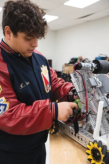 St. Mary’s Academy junior Keaton Garcia works on the robot that he has been developing with his team all year. Garcia is captain of the Fayetteville high school’s robotics club. The program includes about 40 students across middle and high school grades known as the “Cybercats.” Photo by Julianna Leopold